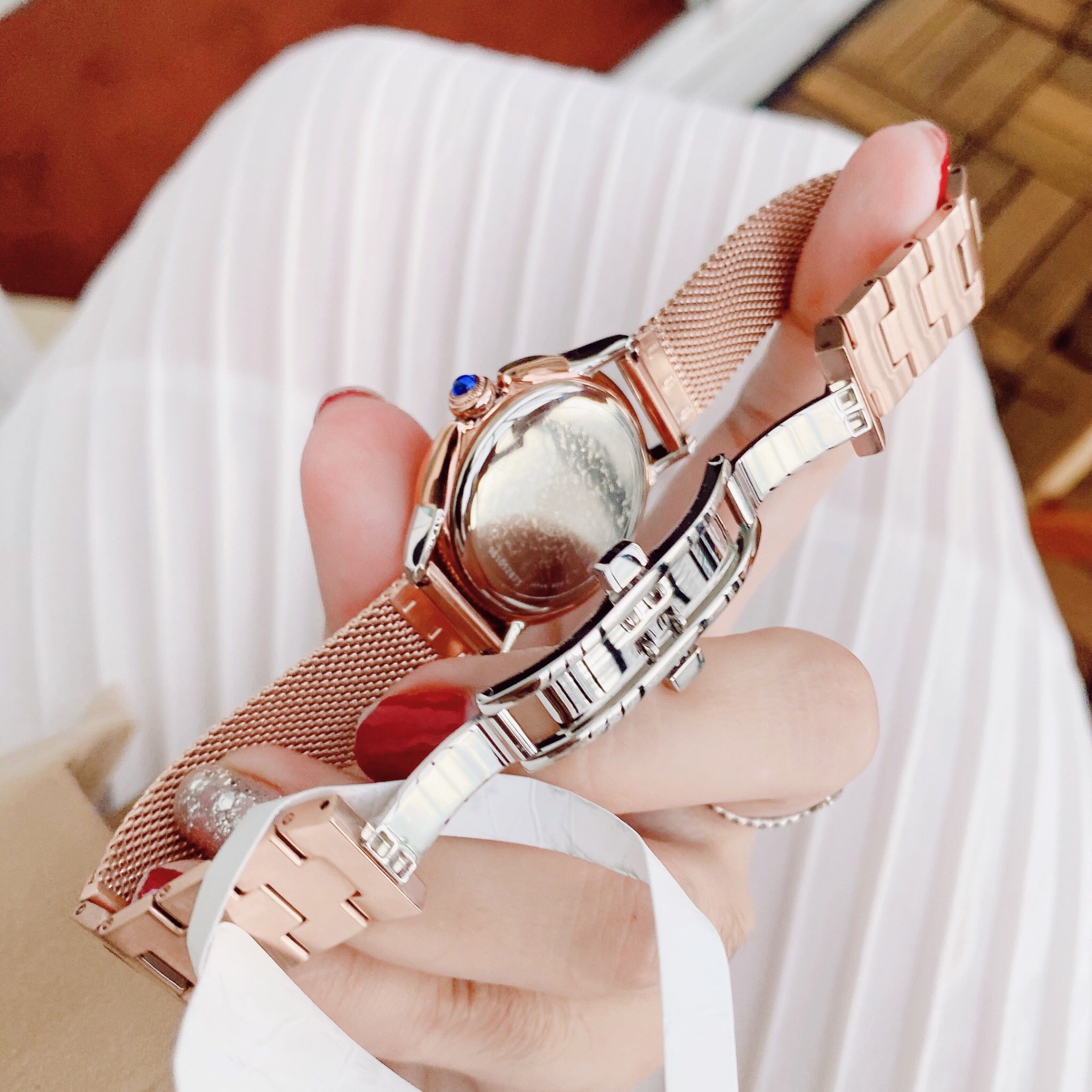 - Kính sapphire, viền thép vàng hồng, chịu nước 50m