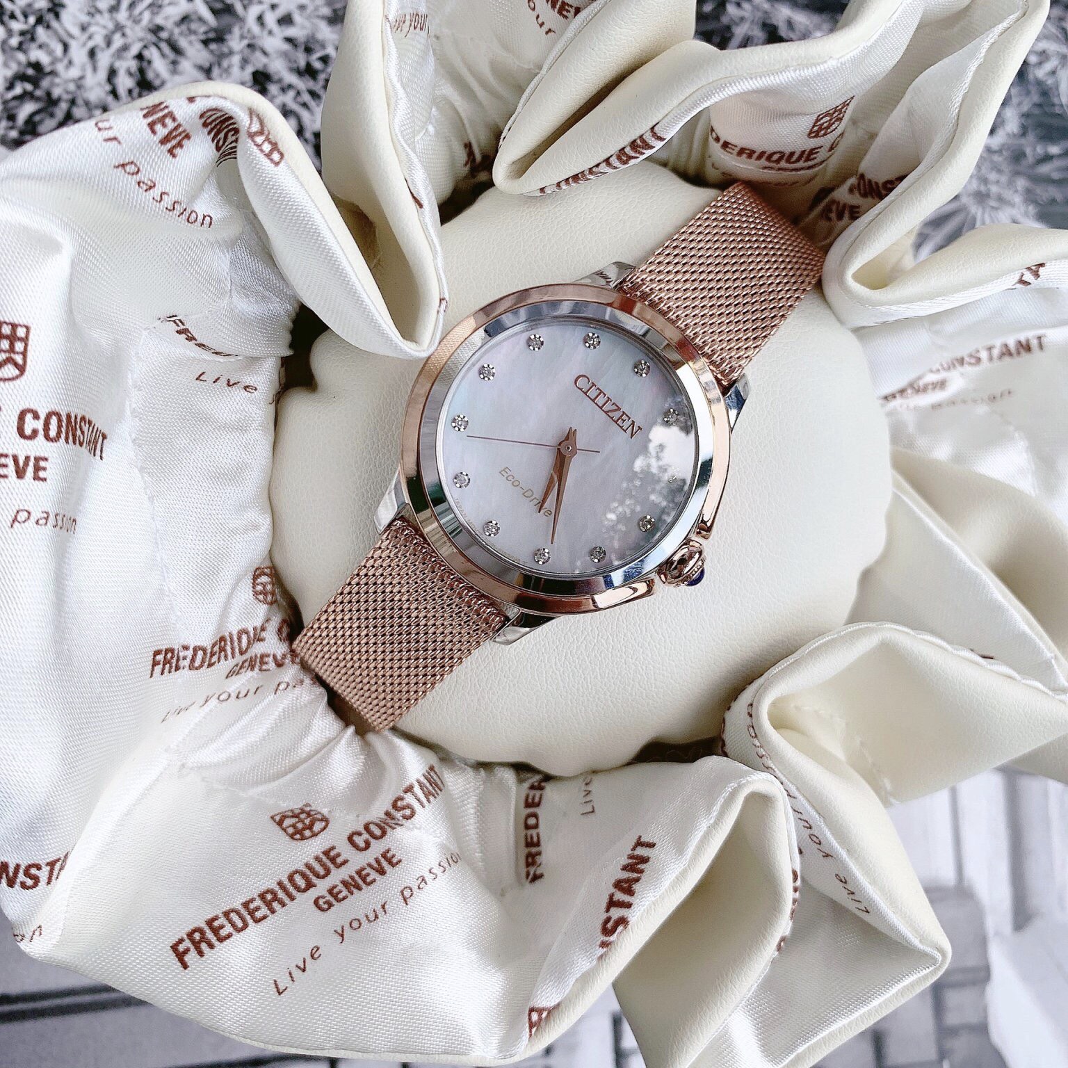 - Citizen EM0796-75D Eco-Drive Ceci Diamond mặt khảm trai, cọc số đính 12 viên kim cương, thiết kế bo viền thanh mảnh, núm đính đá spinel cabochon xanh blue