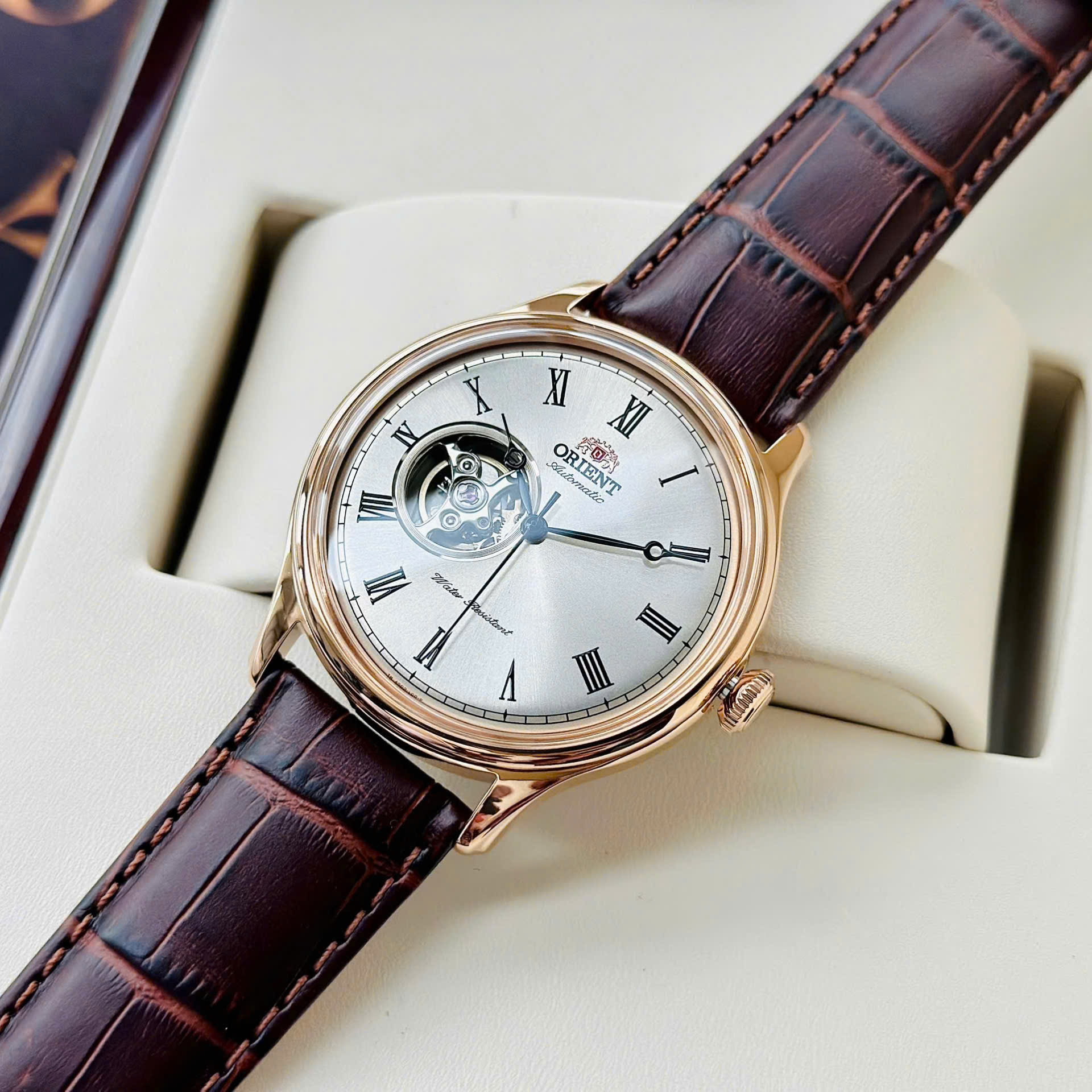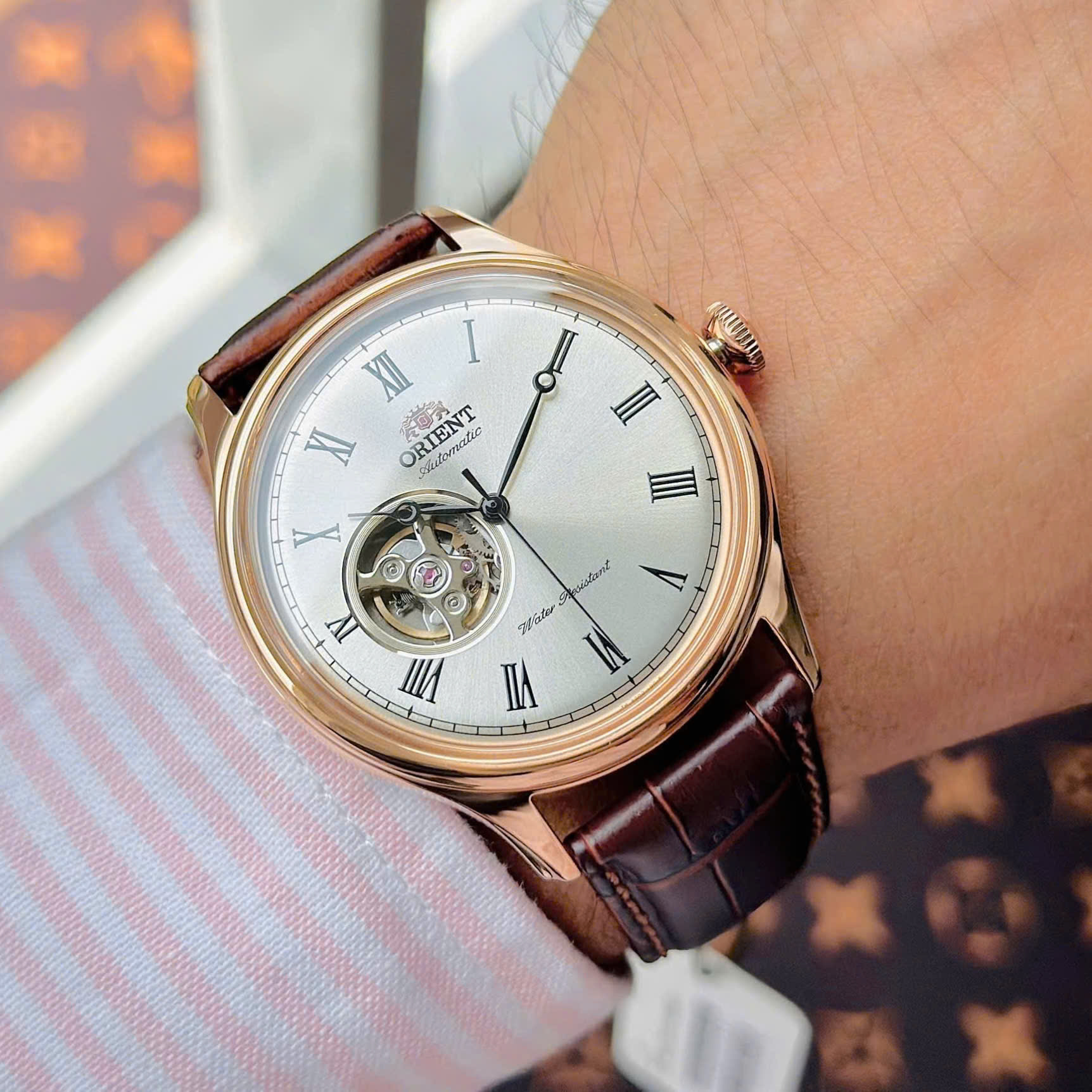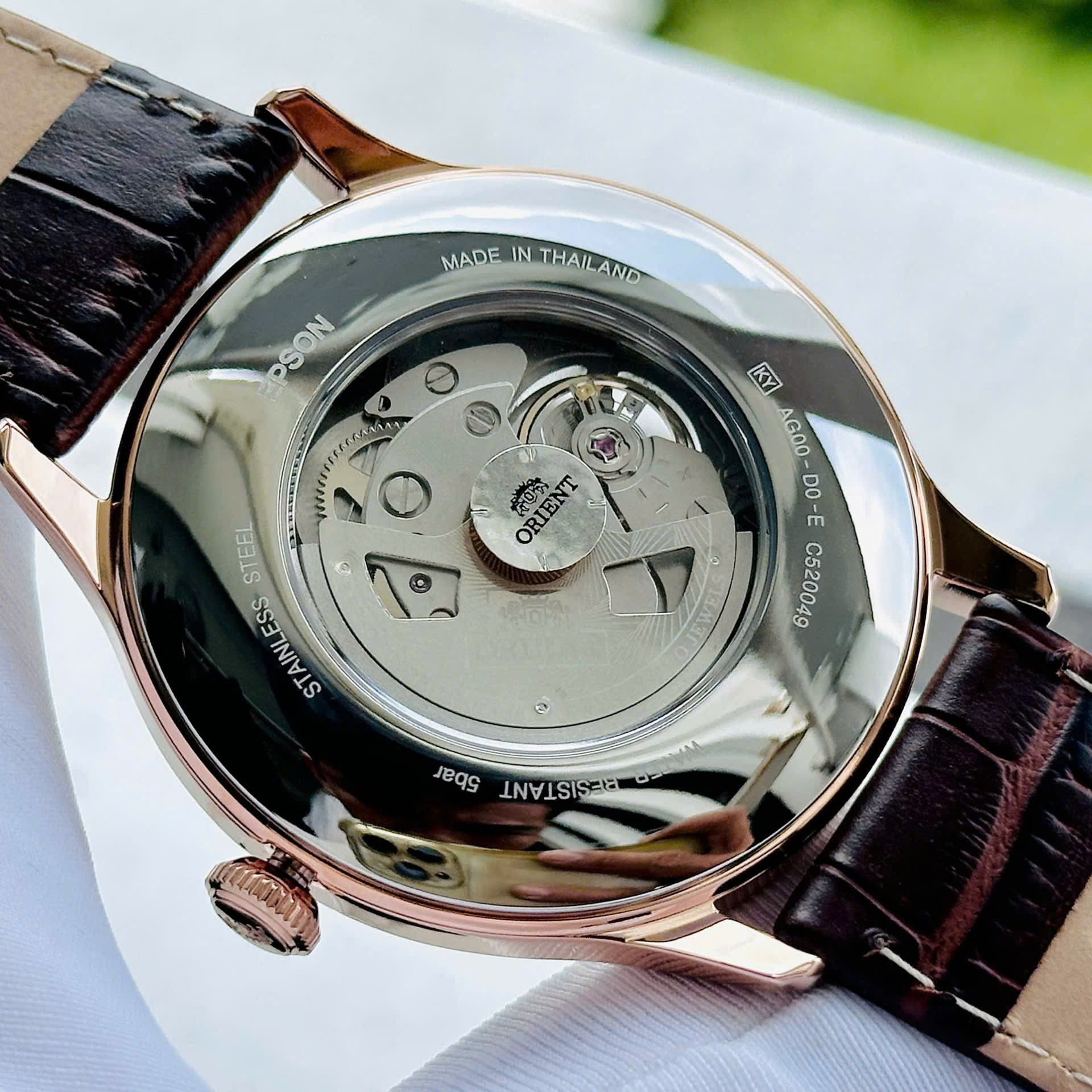 – Máy Automatic (cơ) in house Orient F6T22, đầy đủ tự động + lên cót tay và dừng kim giây khi chỉnh giờ