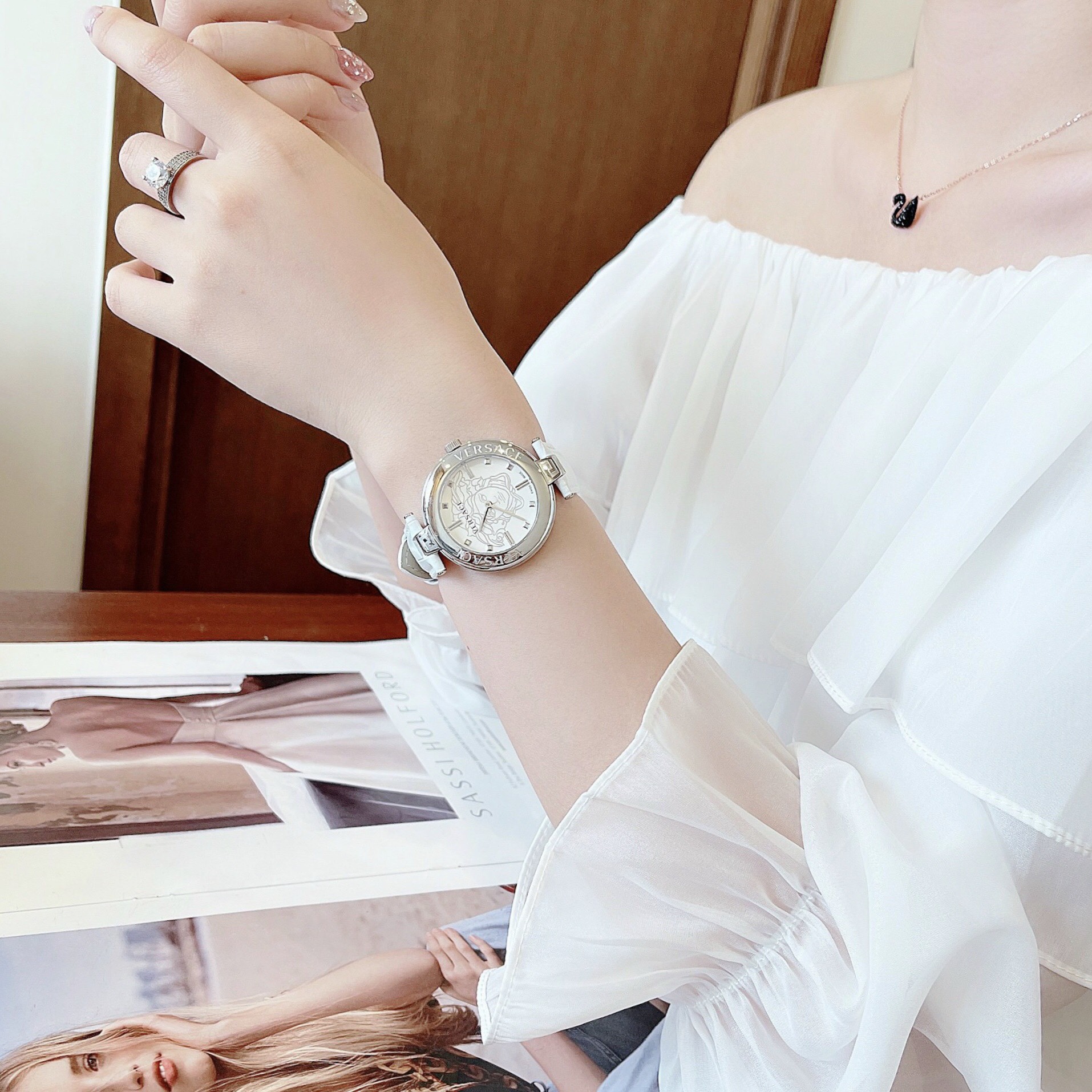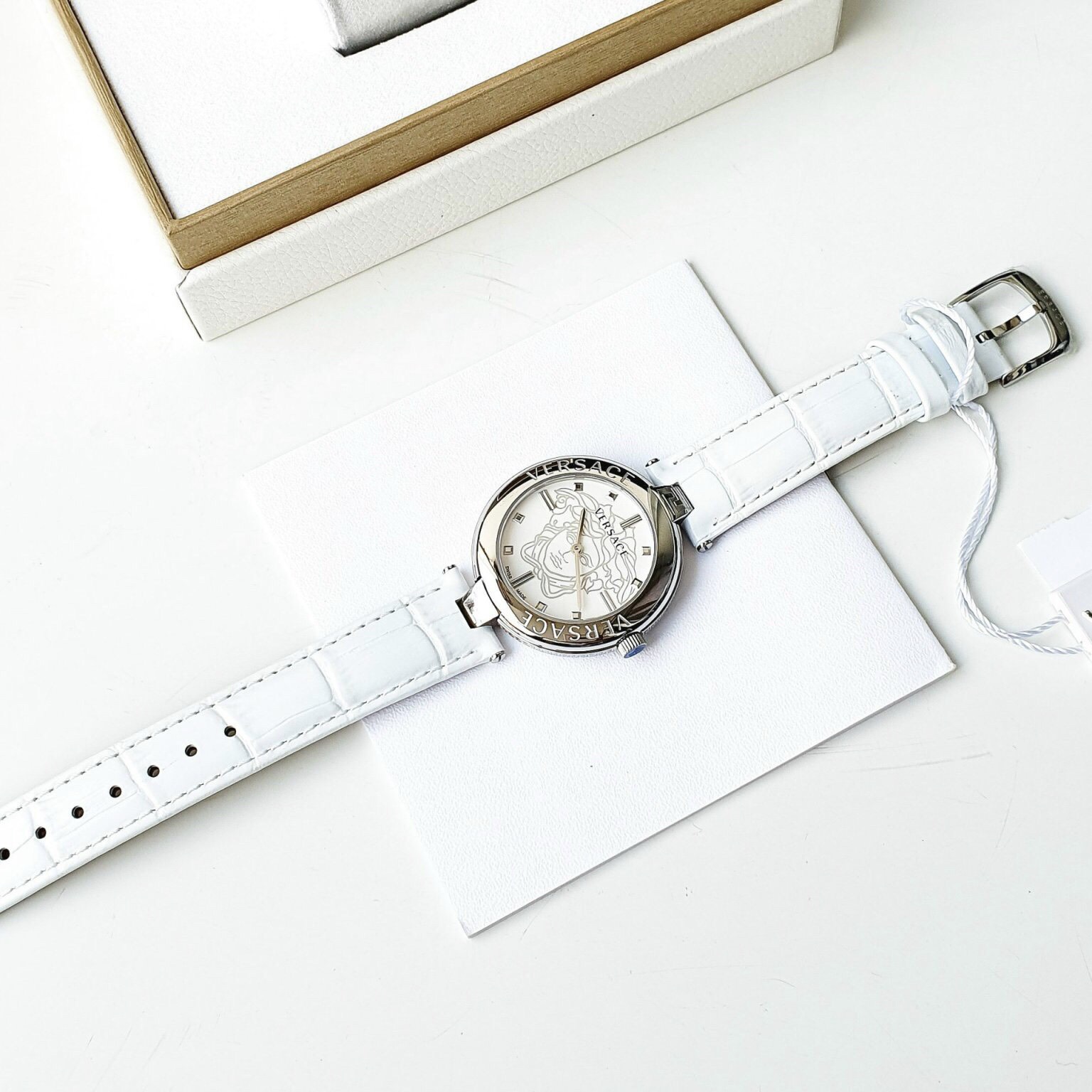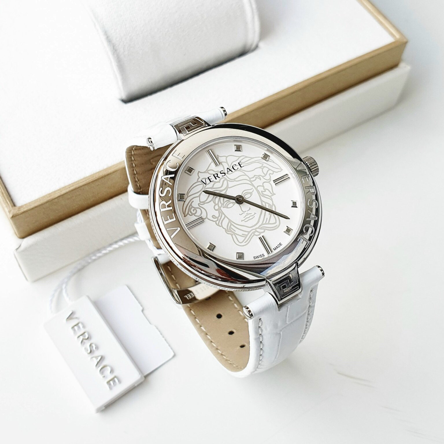 - Viền silver khắc tên thương hiệu và hoạ tiết Greca đắt giá