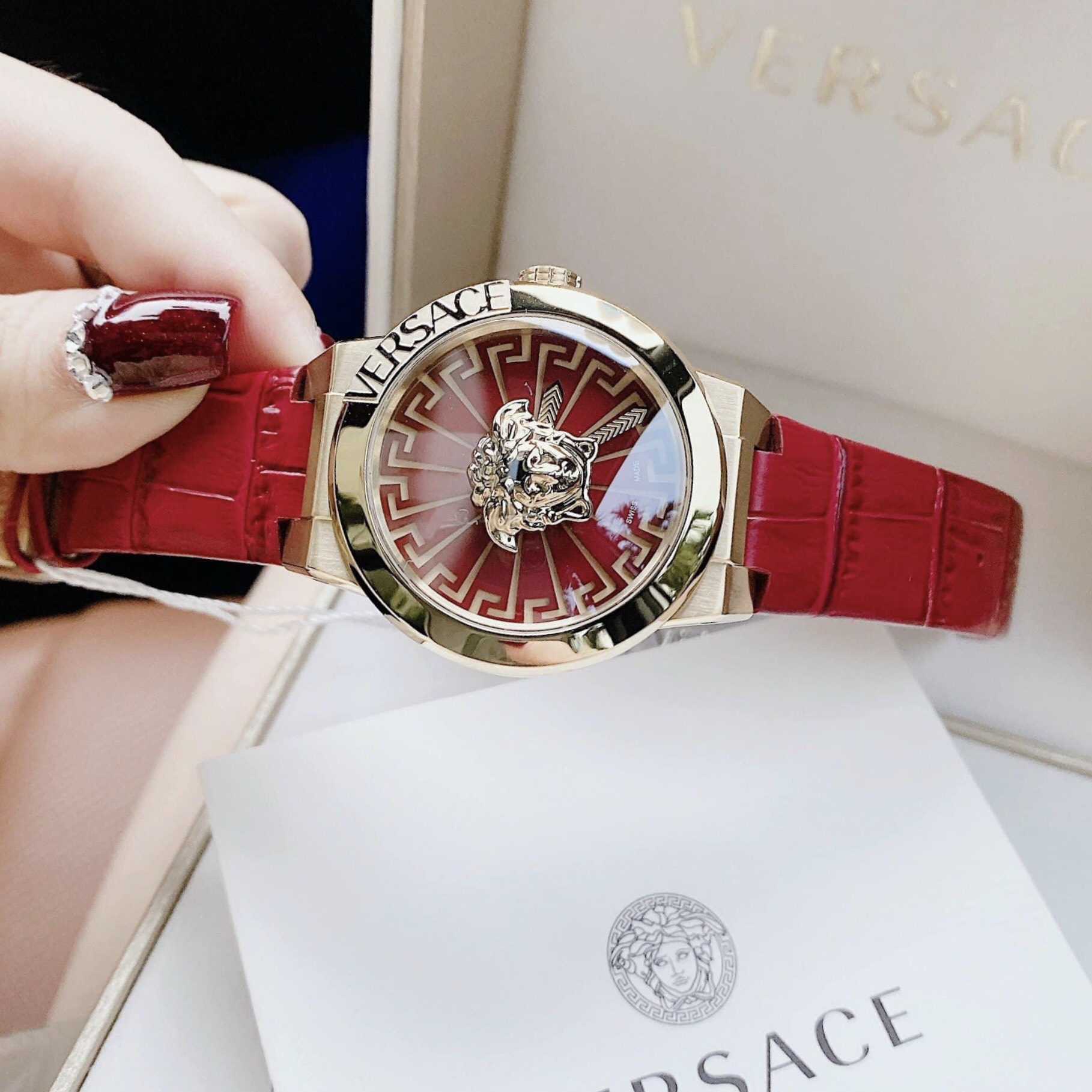 - Logo Medusa 3D màu gold nằm chính giữa nổi bật trên nền màu trắng chải tia nổi – hoạ tiết Greca sát cạnh viền
