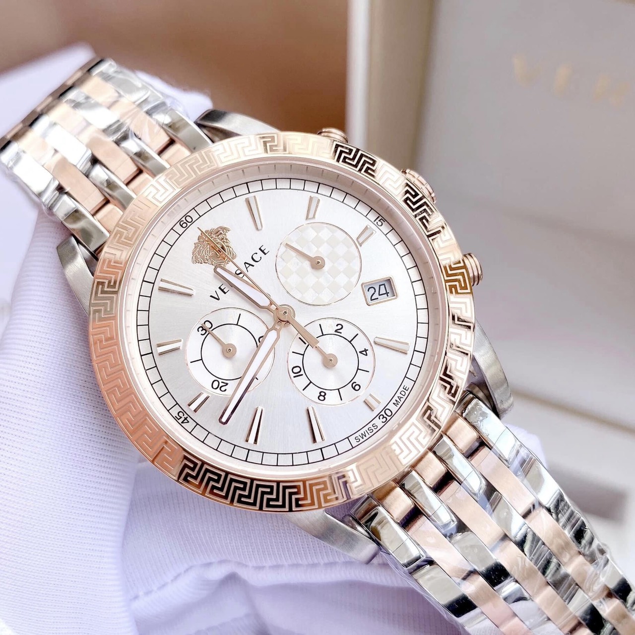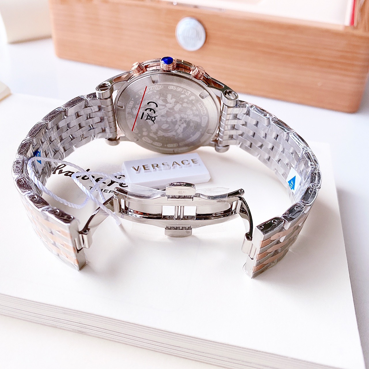 - Logo medusa đặc trưng góc 12h, viền rose, dây thép ko gỉ phối tone demi rose cực sang… hiển thị lịch ngày góc 4h