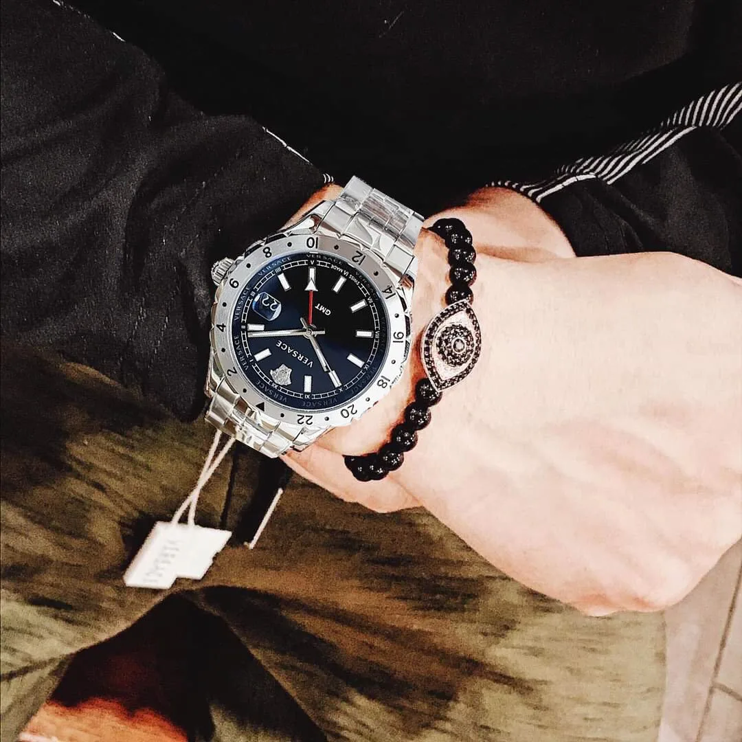 - Dây kim loại bạc, mặt đen mạnh mẽ, nổi bật
