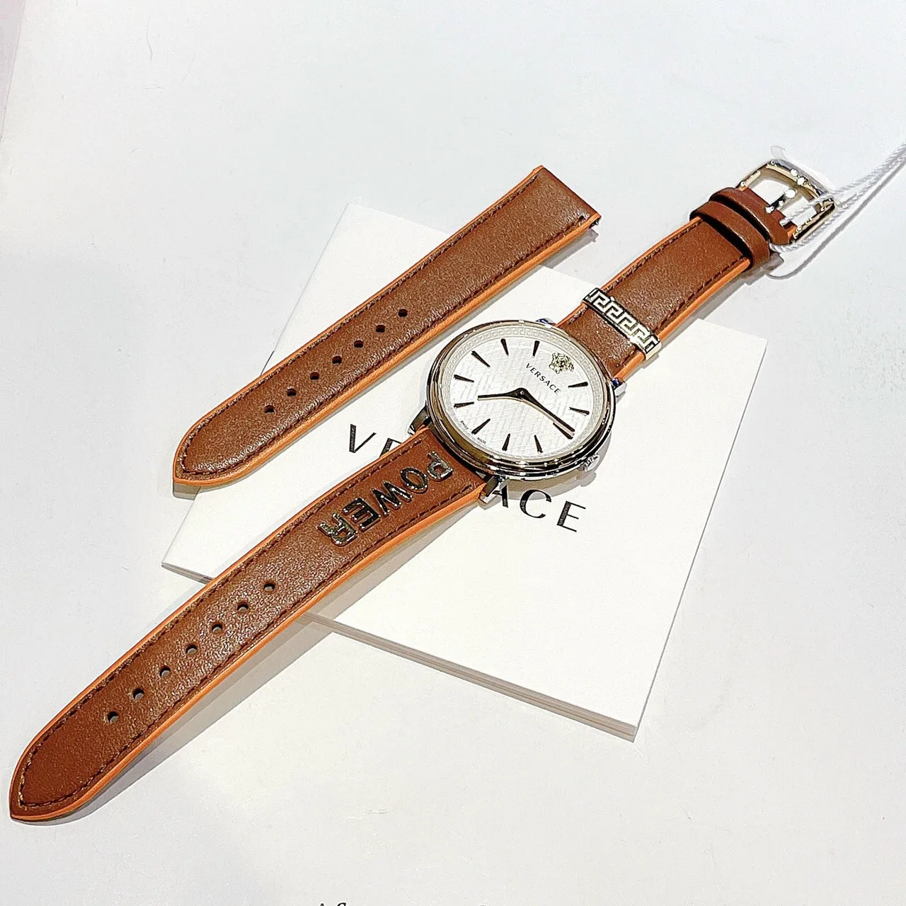 - Dây tông màu cam đất , mặt đồng hồ viền màu gold cọc số & logo Medusa màu gold trên nền mặt đồng hồ màu trắng nổi bật.